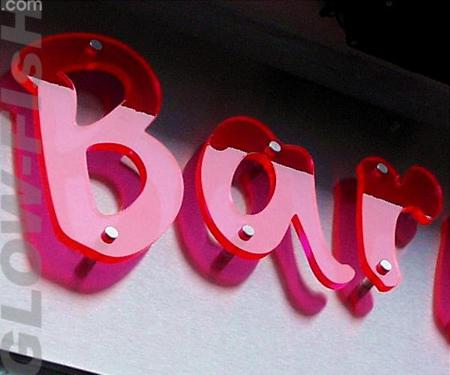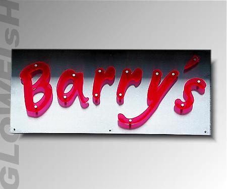 Lichtwerbeanlage mit einem Hintergrund aus gebürsteten Alu mit ausgelaserten Buchstaben aus Plexiglas( LISA platten). Die Buchstaben sind mit Abstandhaltern aus Edelstahl befestigt.