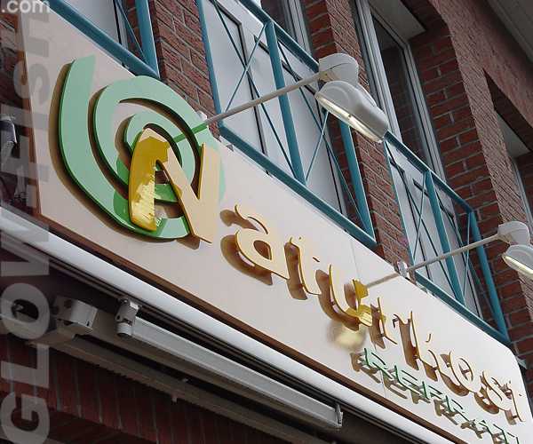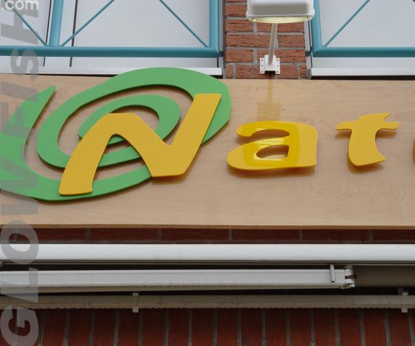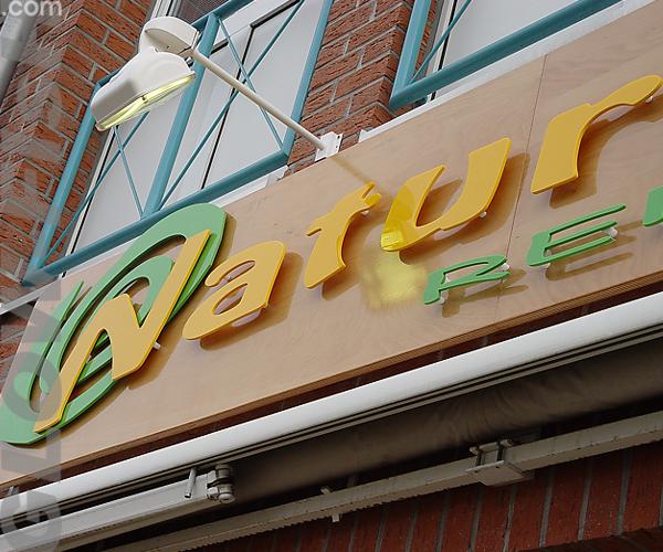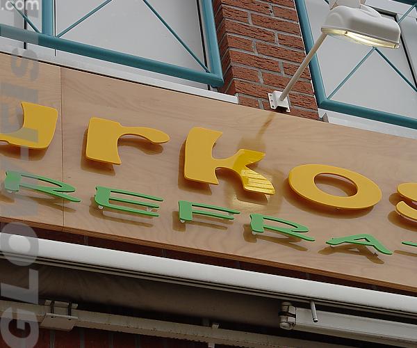 Lichtwerbeanlage aus einem Hintergrund in massiven Holz mit Ausgelaserten Buchstaben aus Plexiglas.